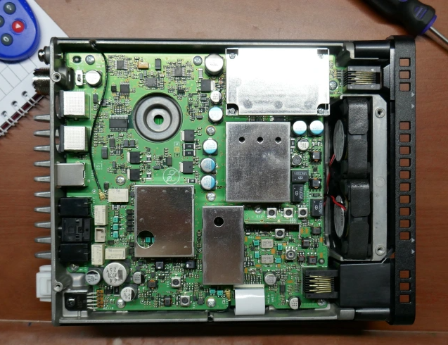 打开FT-891的上下盖,你会发现FT-891用料扎实。元器件排列整齐,分布错落有致,很多地方都设置了屏蔽罩和屏蔽措施降低机内信号的窜扰。机内大量使用日本原产的FT富士通继电器,性能和耐久性更为可靠。两个主动散热小风扇使用的是名牌NMB的04010SS 12V 0.06A规格产品。FT-891使用的射频功放管是2枚现代小型台式短波电台中常用的三菱RD100HHF1场效应管,可靠性所谓久经考验。